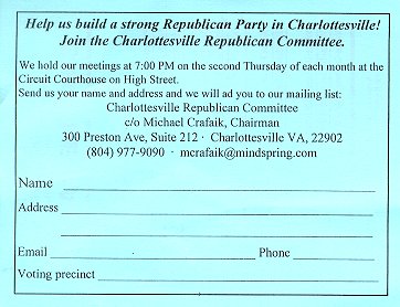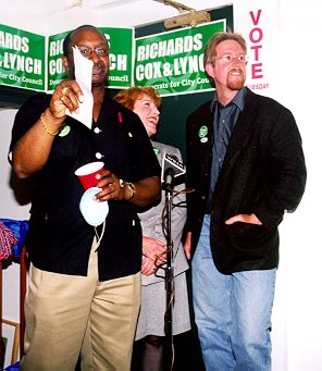 "Moments later, [Maurice] Cox entered the building to loud cheers. The re-elected councilor embraced Lynch, gave him a high-five, then hugged Richards." "Richards said she looked forward to 'an interesting four years of finding our way.' She said that her running mates share her love of the city, though they sometimes 'look in different directions'" (Davide Dukcevich, The Daily Progress, May 3, 2000). "'The Democrats did a better job of pulling together and the Republicans didn't even make much of a pretense,' said Lloyd Snook, a Democratic activist." "Republican Party leaders agreed that their party's differences were harder to patch." "Michael Crafaik, city GOP chairman, said his own party's slate of candidates 'disinvited me' from their post-election party at Lord Hardwicke's restaurant Tuesday night. 'I think that's pretty incredible asking the chairman not to come,' he said. 'I was a bit miffed'" (Davide Dukcevich, The Daily Progress, May 3, 2000). In a recent interview with Coy Barefoot in the April 11th C-Ville Weekly, Crafaik said that he was not encouraged by the degree of conservatism in his party's slate. "'Not one of our candidates are even members of the City [Republican] Party,' Crafaik said flatly. 'So it's hard to tell how committed they are to our issues.'" "We put the Council Watch investigators to work on that one. Elizabeth Fortune, though she considers herself an Independent who leans right, was not a member of the Party until she became a candidate. Fortune told us it was her work in the Junior League that had prevented her from joining a party until now-- though she was a closet Republican all along. (Republican women in the Junior League? Imagine that.)" "But Junior League Executive Director Jane Helfrich in Richmond says that no volunteer who works with the League is or can be prevented in any way from joining a political party." "Jon Bright, a proud supporter of Paul Harris and George Allen, asserts that he has been an active, dues-paying member of the City Republican Party for five years. 'I don't know what [Crafaik] is talking about,' he sighed. "Republican candidate John Pfaltz admits that he is not a member of the party he represents. The pro-business candidate adds that moderates on the right are the key to a conservative win-- that ultra-conservatives 'don't stand a chance' to get elected in the Donk haven that is Charlottesville" (Hawes Spencer, electronic mail, May 1, 2000). ![]() "Dale McGlothlin, the former city GOP chairman who ran the campaigns of Republicans Bright, Elizabeth Fortune and John Pfaltz, said his party's disarray did hurt the ticket." "'Perhaps the Democrats for Change captured the momentum for leading the charge for change after our fiasco,' said McGlothlin, referring to an assault charge that Crafaik swore out against him in March. The large Democrats for Change faction that helped nominate Maurice Cox and Lynch energized the majority party." "'I think [the Democrats for Change] played a huge part,' said John McCutcheon, a Democratic stalwart. 'It opened up the door for people who felt there wasn't a progressive enough agenda in the city'" (Bob Gibson, The Daily Progress, May 3, 2000).