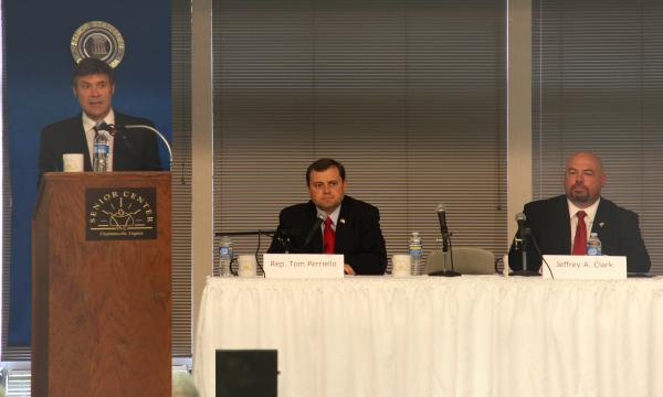 Tom Perriello, Independent candidate Jeff Clark. The center seat was reserved