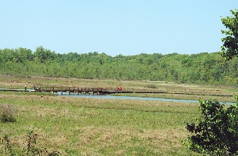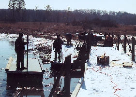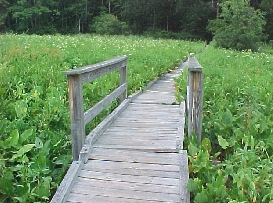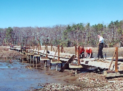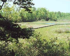 Point of Rocks Park is described in the City*Smart Guidebook for Richmond (Gail Doyle, John Muir Publications, 2000) as a 'nature lovers paradise' with a wonderful boardwalk that leads eagle- and wildlife-watchers out to an observation deck overlooking the marshlands and the woods." ![]() Over twenty-two years ago, Chesterfield County, Virginia acquired "over 60 acres of tidal marsh formed around Ashton Creek, a tributary of the lower Appomattox River, from the Continental Can Company. This acquisition completed the County's landholding [188 acres] to allow environmental interpretation from the upland plateau, across the stream valley bluffs of over 75 feet in height, all the way to the river; three (3) different unique landforms and ecosystems" (Chesterfield County Parks and Recreation Department, September 28, 2001) ![]() Over time, boardwalk, observation platform and walkway extensions were lost as "the effects of water, rot, decay and countless floods took its toll and the wooden system finally collapsed on itself" (Chesterfield County Parks and Recreation Department, September 28, 2001) In 1994, a bond issue was approved which contained funds for the rebuilding of the boardwalk and other trail improvements. In late winter/spring of 2000 and 2001, after significant study, "workers braved extreme cold and oppressive heat and all forms of biting insects" " (Chesterfield County Parks and Recreation Department, September 28, 2001) to improve the boardwalk and trail system at R. Garland Dodd Park at Point of Rocks. " The project was constructed using principally the two (2) Sheriff's Workforce Crews [including 32 inmates over two years] and administrative and trades crew support from department staff. Construction could only be accomplished during fall and spring periods due to unfavorable working conditions at the marsh. ![]() The first task was removal of all the old boardwalk and dismantling the unusable portion of the bridge. No equipment/vehicle access was possible across the marsh. All removal was by hand and on foot. The next task was construction of the wooden walkways and platform to serve as a staging area. The doc sections were constructed on-site and the walkway progressed from trailhead to bridge. A specially dolly was built to move the completed section out into the marsh. ![]() Each dock section required assembly of 10 structural members, two (2) floats, 33 decking boards, 99 clip fasteners, four (4) hinges and 40 bolted connections. In total 90 sections were assembled, rolled in place and secured to form the boardwalk. All was accomplished with inmate labor for the most part, most semi-skilled and different groups of guys to train every two (2) weeks." (Chesterfield County Parks and Recreation Department, September 28, 2001) ![]() The project was completed at a total cost of $234,141.35, with a net savings to the county of $135,858.65. [contracted costs were $370,279.20]" (Chesterfield County Parks and Recreation Department, September 28, 2001) ![]() Having some time on my hands in Richmond, Virginia, I was naturally pleased to go by to see the wildlife and boardwalk for myself - having completely forgotten the recent impact of Hurricane Isabel. For now, much of the boardwalk has been destroyed. ![]() According to Jennifer Wampler, "Estimated cost to replace by contracting would be $280,000 as reported to FEMA for the floating boardwalk. We have located the walk within the marsh area and believe it to be reusable with minor repairs. We are ordering the floating barge and transport boat equipment to retrieve the boardwalk this winter. We plan on retrieval in late spring and summer, with re-grand opening by mid-summer 2004." (Jennifer Wampler, electronic mail, February 2, 2004) ![]() This should not, however, hold up your own visit to the park. There are walking trails, picnic shelters, overlook areas and bird watch areas still in tact. ![]() My visit was late in the morning, when it was quiet [with the exception of bird life] and overcast after a winter snow, a pleasant respite. ![]() I stopped for a while on a pebbly beach to watch flocks of birds travel up and down the Appomattox River, only to run across the same types of birds flying high over Ashton Creek Marsh. ![]() ![]() ![]() Inland and upward from the river and marsh toward the bird watch area, I found robins and jays and rabbits and squirrels along with berries and pods littering the ground. ![]() ![]() ![]() ![]() ![]() According to Naturalist Mark Battista, the wildlife fared Hurricane Isabel better than [the floating boardwalk or humans in the surrounding area]. He says, "At the Dutch Gap Conservation Area, I did notice that some of the heron nests were blown out of the tree and/or the entire tree was blown down. The frogs loved it" (electronic mail, February 3, 2004) Note: On my visit, trees were down everywhere: many chopped up to clear passage way to the extensive system of trails. Smaller pictures above are courtesy of the Chesterfield County Parks and Recreation Department. The larger pictures, taken on January 30, 2004, are my own. For more information, contact Park Superintendent - Jim Perdue, 530-2459.