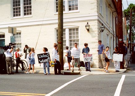 With all of the trappings, one might have confused the toilet bowl rally yesterday for a 'living wage' summit. Certainly the ingredients were there: representatives from three groups of living wage activists [Citizens Against Global Exploitation (C.A.G.E.), Labor Action Group (L.A.G.) and the Virginia Organizing Project (V.O.P.)]; the president of the Charlottesville Regional Chamber of Commerce, a smiling Charlottesville city councilor, reporters and photojournalists from several newspapers and local television stations and last, but not least, the Charlottesville chief of police. ![]() Living wage activists called the press conference to dramatize the plight of low wage employees and to urge Chamber of Commerce officials to reevaluate their negative stance toward a living wage.
