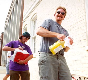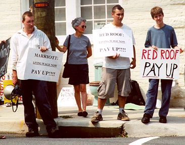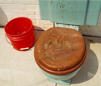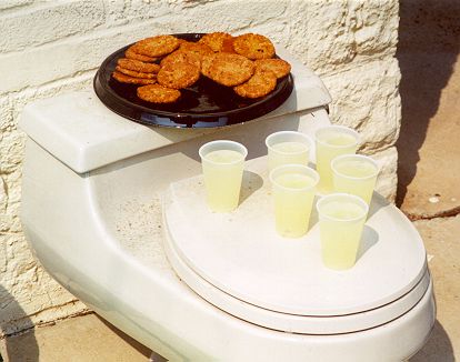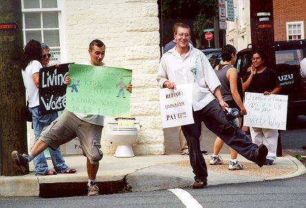 The action began when "Proponents of a 'living wage' planted three dirty toilets outside the Charlottesville Regional Chamber of Commerce's office Tuesday [July 31, 2001] and offered business representatives, and anyone else, $6.50 an hour to clean them. 'They don't understand what it means to make poverty wages,' protester Andrew Holden said of chamber officials as he stood in front of the toilets on the sidewalk facing East Market Street. 'We're out here trying to get them to come out and get an idea of what it's actually like to work - to clean toilet bowls, in this case - for $6.50 an hour. If they don't, then I think they've made our point for us'" (Reed Williams, The Daily Progress, August 1, 2001). No way. ![]() Instead, chamber president Timothy Hulbert offered participants lemonade and oatmeal cookies and invited representatives of the living wage group in for a private meeting.