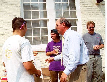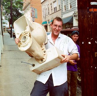 Earlier, Nicholas Graber-Grace met with police chief Long 'to make sure the protest setup was legal and that the toilets were not blocking the sidewalk'" (Reed Williams, The Daily Progress, August 1, 2001). After assessing the situation, police chief Timothy J. Longo seemed to be well satisfied and moved on down the street. The meeting with chamber president Hulbert lasted about thirty minutes, after which Graber-Grace "shared his version of the meeting with an audience of about a dozen people. 'They do not support a living wage. They are unwilling to say that paying poverty wages is unjust. They are unwilling to say that their payment of poverty wages is against the American way,' Graber-Grace said. 'They were not willing to take our challenge of scrubbing a toilet.' .... ![]() Hulbert said that Graber-Grace did not ask him or anyone else in his office to clean the commodes, and that he did not know if he would have done it. 'We have enough toilets to scrub,' he said. 'We have three here and [I have] two at home. I'm not particularly inclined to participate in a choreographed stunt, but they're lovely people. They're well-intentioned and committed.' .... Hulbert repeated that the chamber supports the notion of higher wages for low-income workers, but that the path to achieving that goal lies in education and job training, not 'wage fixing.' And though he called the choice of toilets for props a 'head butt' to the chamber, Hulbert indicated that the discussion was productive. 'I believe when people are talking and, more importantly, when they are listening, things, by definition, get better,' Hulbert said" (Reed Williams, The Daily Progress, August 1, 2001). So how about those toilets? Charlottesville City Councilor Kevin Lynch was the only person to take up the challenge.