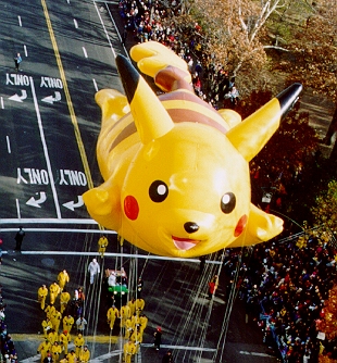 Flags of the 50 States, Statue of Liberty Float, Toy Soldier and 75th Anniversary Parade Star, Willard Scott on the Tom Turkey Float, Curious George, Pikachu and the Old Lahaina Luau Float