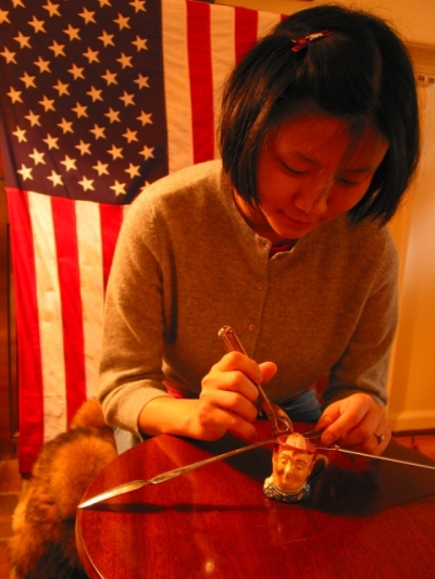 Jee Bang "Practices" Brain Science ![]() George, You don't need half a brain to know that brain science is cool. Recent advances in neurosciences have led to a better understanding of the causes underlying various neurodegenerative disorders such as Alzheimer and Parkinson diseases. ![]() Experimental methods have been used to induce the regeneration of damaged neural tissues, which was previously thought to be impossible. There is still much more to be done, and I look forward to contributing to this fascinating field. "Practicing" on an egg-poacher is one way to get started ;) Jee Bang (electronic mail, November 9, 2003) Note: Taking care of our flag is like taking care of our country. What is important to you? Is there a statement you would like to make? A cause you would like to advocate for? If you would like to be immortalized on my website showing