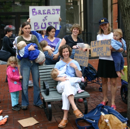 Breast feeding has not always been readily welcomed in public. In April 2000, a row over breast feeding broke out in the House of Commons, where MPS who wished to nurse their children were "directed to the Lady Members Room or the disabled lavatory off the Lower Waiting Hall" (The Economist, April 22, 2000). In February 2002, a painting by Shawn Dell Joyce of Montgomery, New York was removed from Stewart International Airport in Orange County, New York - part of a "series about human interactions with natural elements" consisting of "four panels: mountain scene, children praying, two people in a boat and a nursing infant." This sparked a protest of "40 stroller-wheeling moms outside the airport terminal, waving photographs of breasts and babies at passengers and onlookers for nearly two hours. ...[During the protest], a few men and women did avert their eyes from the nursing mothers and walk on. But others stopped to voice their support. Sydney James Chiswell, 53, a real estate consultant from Charlottesville, Va., said that Ms. Joyce's painting should be displayed at the airport even if it offended some people. 'The problem we have as a culture is that we've driven political correctness to such a degree that we overlook the obvious - and the obvious is that it's art,' he said. 'It makes me wonder what the censors would have said about Adam and Eve.' As Mr. Chiswell rolled his suitcase away, he called out to the nursing mothers: 'Hey, I'm a breast-fed baby. Look at the success!'" (Winnie Hu, The New York Times, February 28, 2002). In November 2003, "45 nursing mothers cradling their newborns, demonstrated their solidarity by publicly nursing their children on the sales floor," after a customer "was asked by a store employee to leave the children's section and resume feeding her newborn in the ladies'room" at a Washington, D.C. Barnes and Noble. According to event organizer Alli Gersh, the demonstration was a smashing success, especially when "'the manager finally came out and explained that the employee made a mistake and that, in fact, breast-feeding is permitted in every part of the Barnes & Noble store.'" (Anne Schroeder, The Washington Post, November 4, 2003) In June 2004, Suzy Stone was on the Charlottesville Downtown Mall eating at Atomic Burrito (on 2nd st.) and was told by a co-manager that nursing her 6 mo. old was inappropriate to do in the restaurant. ![]() Suzy says, "When I told him how offended I was he got very rude, I asked for my money back which he threw on the counter and I had to pack up my children and leave. I told him as I was leaving that I was going to tell everyone I knew that his restaurant did not allow nursing and he said "Go ahead" (electronic mail, June 3, 2004). ![]() Within 48 hours a demonstration was organized on the mall catacorner to Atomic Burrito, which included approximately 40 adults with an equal number of children in tow. ![]() By the time of the demonstration, Atomic Burrito had issued the following statement: Atomic Burrito strongly supports the rights of mothers and families. Furthermore, Atomic Burrito unconditionally supports the rights of mothers to breast feed within the restaurant specifically and in public generally. Atomic Burrito does not discriminate on the basis of race, sex, religion, sexual orientation, age or familial status (Statement of Policy, June 4, 2004). Just when I thought we were at risk of losing our No. 1 city status. Please send your thoughts about breast feeding in public to george@loper.org