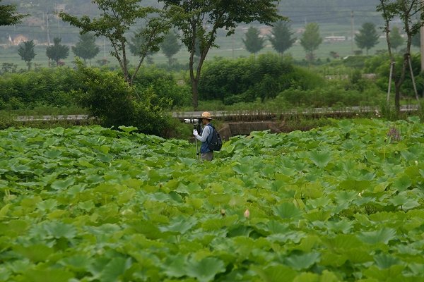 Photographer with Lotus Blossoms, Kyongju, South Korea, July 2005